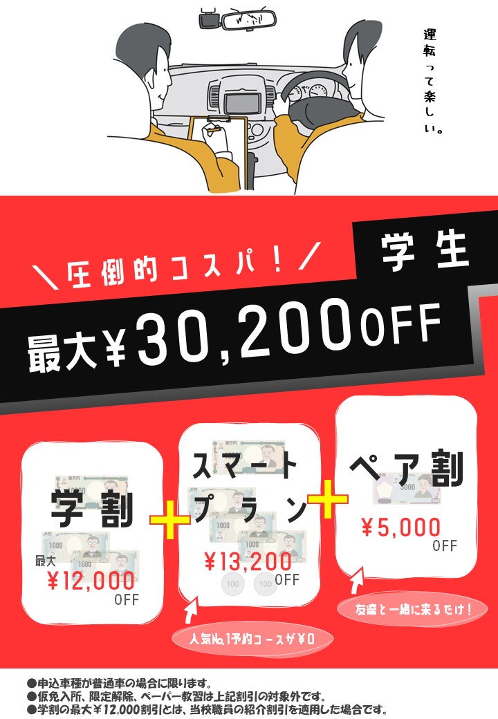 さらに、10/16~11/30の期間中、手続き前に以下の内容をご提示いただき普通車でご入校いただくと、先着50名様に限り下記の内容を適用いたします !他のキャンペーン等との併用はできません。諸条件あり。