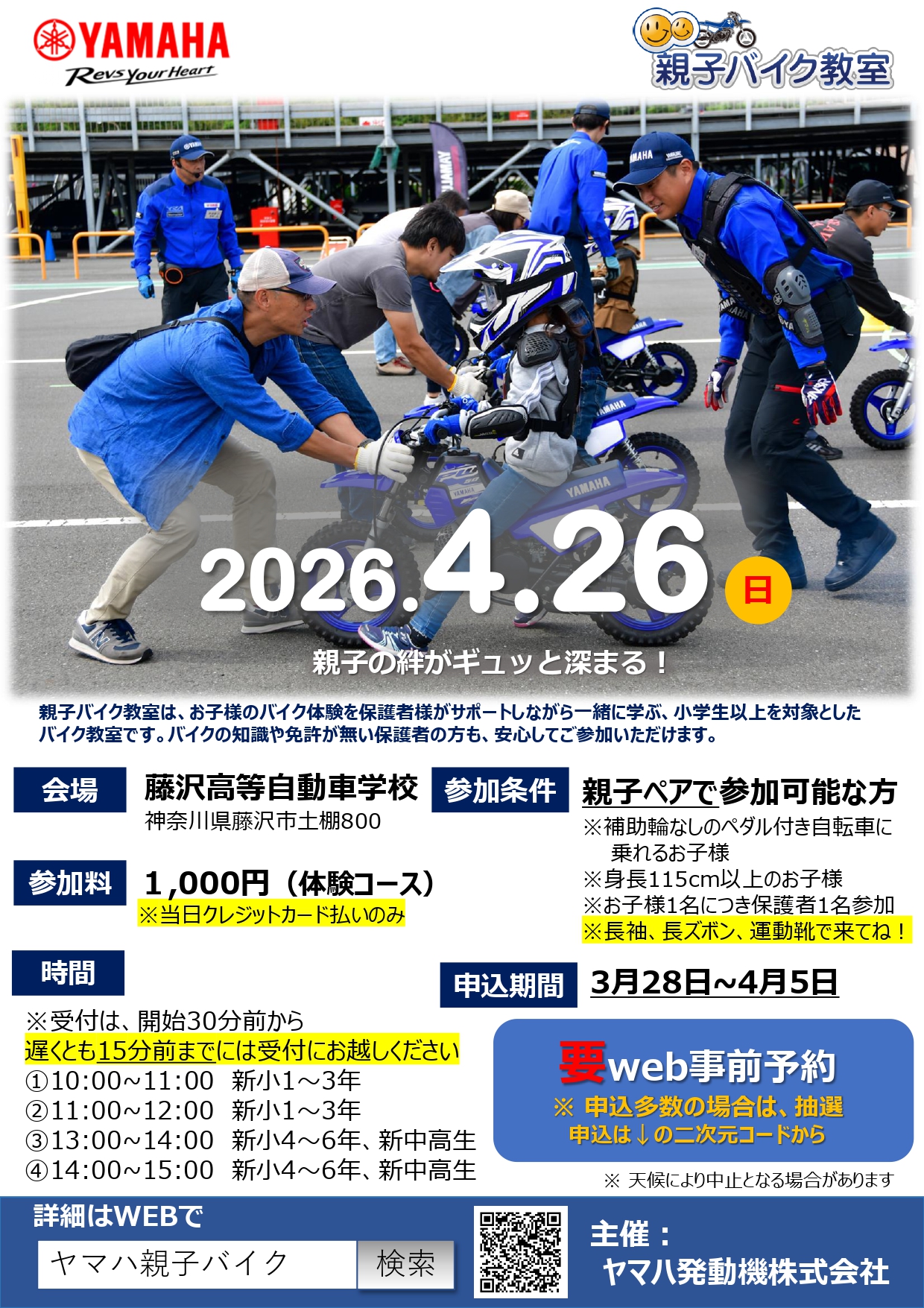春のバイク祭りにてヤマハさんによる「親子バイク教室」が行われます。