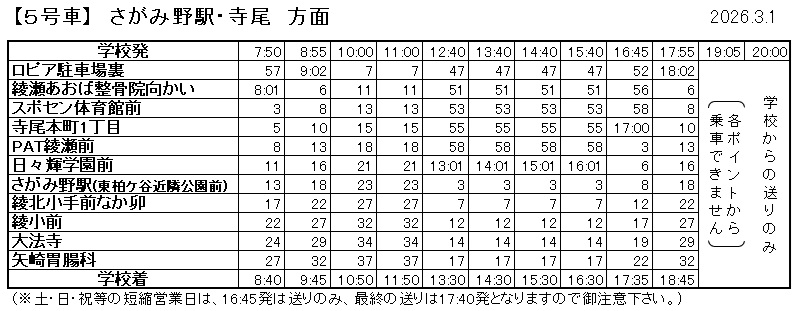 当校 → ロピア駐車場裏 → 綾瀬あおば接骨院向かい → スポセン体育館前 → 寺尾本町1丁目 → PAT綾瀬前 → 日々輝学園前 → さがみ野駅 → 綾北小手前なか卯 → 綾小前 → 大法寺 → 矢崎胃腸科 → 当校