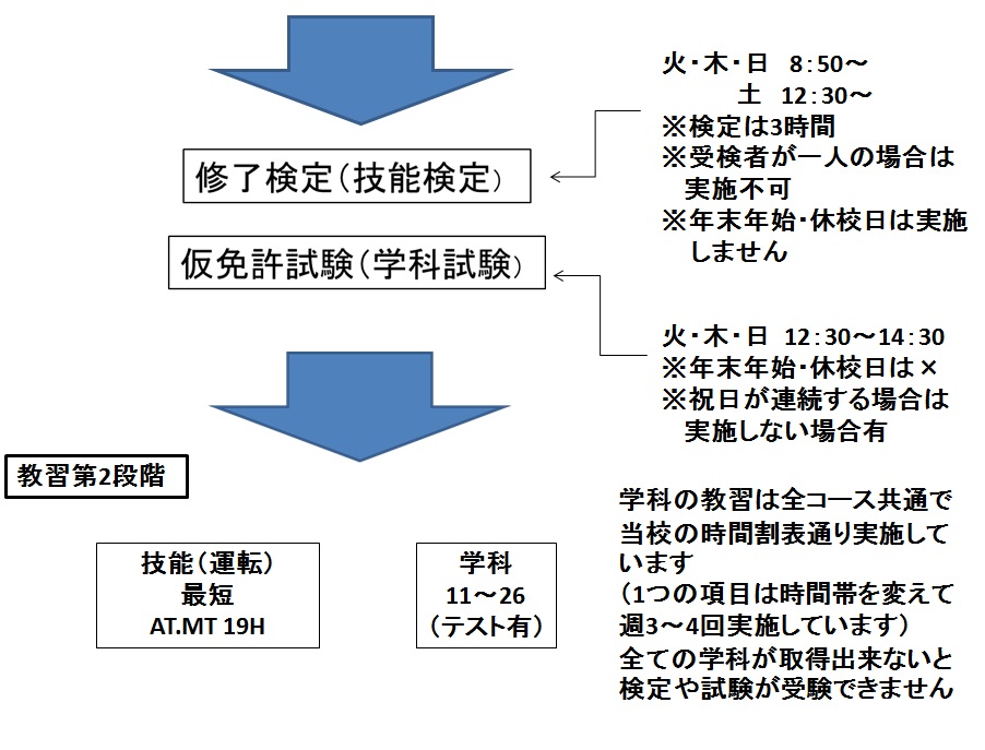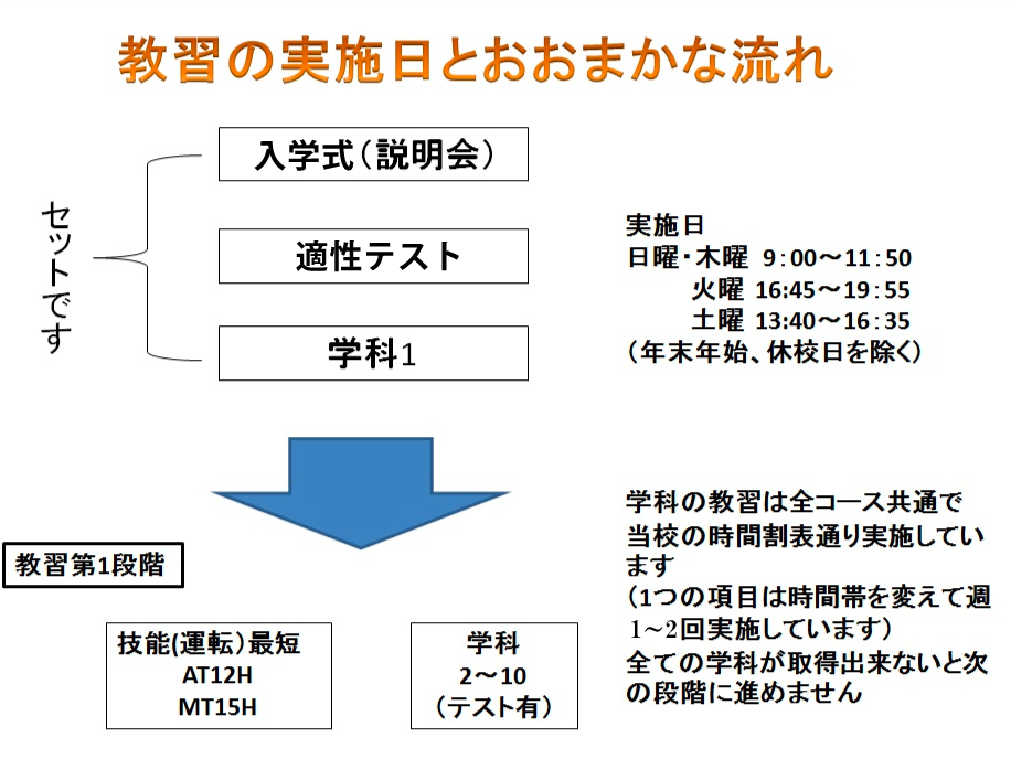 ※免許をお持ちの方(原付は除く)は教習をスタートする前に安全性テスト(適性検査)のみ受講していただきます。※免有の方は時限数が異なります。※入校式を受講していただくには前営業日までにお申込を済ませていただく必要が御座います。